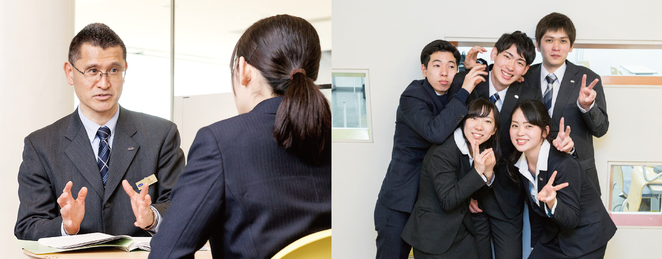 このように豊富な求人情報のもと、学生の希望と将来の夢、そして多様な可能性を実現するために、就職相談には最も力を入れています。学生と担任そして就職担当の三者で密度の濃い相談を繰り返しながら就職を実現していきます。